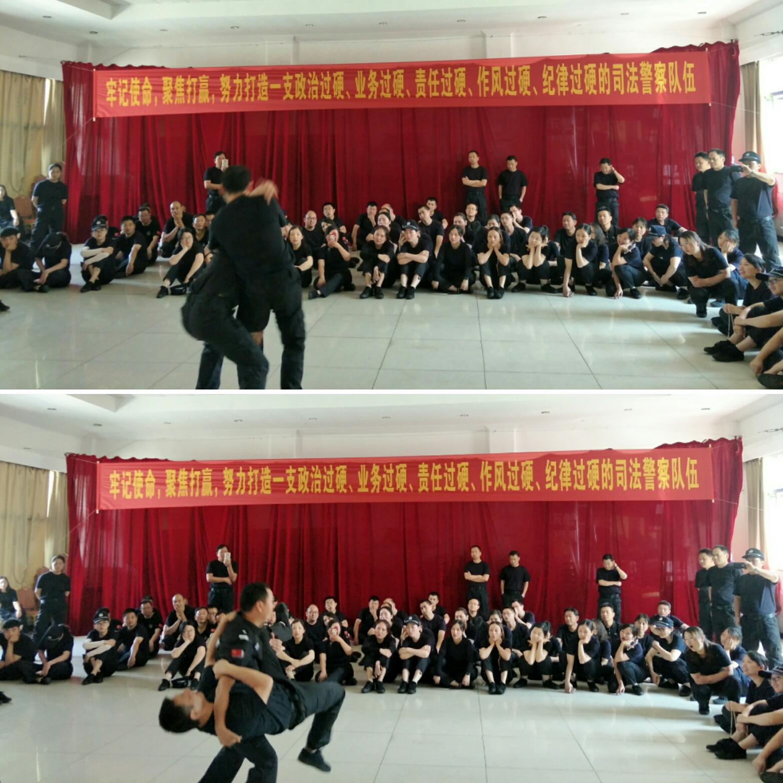 培训中,法警总队将思想教育工作与体能训练有机的结合在一起,通过老师授课和学员之间互相对练与交流提升了每一位司法警察的工作素养,为以后更好的履行司法警察的各项工作职责提供了思想保证及强健体魄。